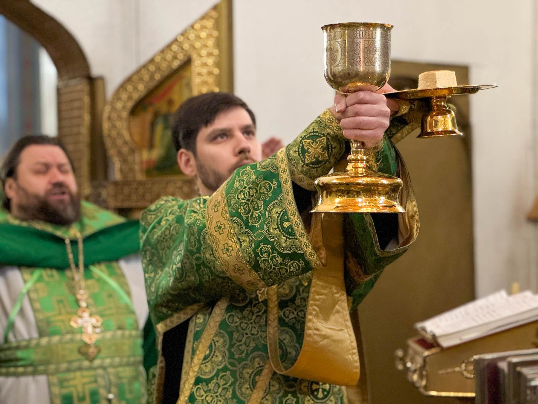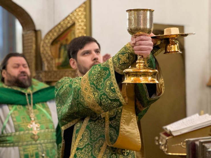 Литургия прошла в атмосфере глубокого благоговения и молитвенной сосредоточенности. Хор исполнил традиционные песнопения, наполнив храм величественными звуками, а прихожане с благоговением участвовали в таинствах.